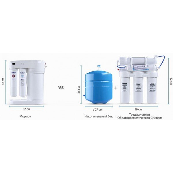 Обратноосмотические фильтры используются для абсолютной защиты от накипи, т.к. полностью устраняют соли жесткости из воды.даЧисло ступеней очисткиКартриджи последовательно очищают воду и от видимых примесей, и от растворенных. Первый картридж задерживает более крупные частицы, а каждый последующий - более мелкие. Чем больше ступеней - тем лучше фильтр очистит воду: поймает более мелкие видимые частицы ржавчины, песка и ила, успеет захватить из воды максимум растворенных примесей - хлора, нитратов, тяжелых металлов и других.4МинерализацияПроисходит после финишной очистки воды. Необходима прежде всего в фильтре обратного осмоса, поскольку такой фильтр полностью устраняет из воды все примеси, в том числе минералы. Минералы добавляются в оптимальной концентрации - для пользы и привычного вкуса воды.даПостфильтрацияФинальный этап очистки воды: картриджи постфильтрации удаляют самые мелкие механические частицы и кондиционируют воду, придавая ей более приятный вкус.даНакопительная емкостьОбычно нужна в фильтрах обратного осмоса. Глубокая фильтрация требует времени. Чтобы Вам не приходилось ждать, пока вода наберется в чайник или кастрюлю, почти во всех моделях используется накопительный бак для чистой воды или другая емкость. В стандартном фильтре обратного осмоса под мойку воды в баке достаточно для семьи из 5-6 человек.даФильтрующий модуль в комплектедаОтдельный крандаДавление в водопроводе не менее, атм2,0Давление в водопроводе не более, атмМаксимальное давление воды на входе в систему, при котором возможна стабильная работа фильтра.6,5Ширина, смОбратите внимание на габариты фильтра, и измерьте, сколько свободного пространства в предполагаемом месте установки.37,1Глубина, смОбратите внимание на габариты фильтра, и измерьте, сколько свободного пространства в предполагаемом месте установки.19,0Защита корпуса от гидроударовдаИсходная водаЖесткая вода – вода с избытком минеральных солей. От нее появляется накипь в чайнике, известковый налет на сантехнике и разводы на посуде. Мягкая вода – та, в которой мало минеральных солей. Нет накипи в чайнике и разводов на посуде. Фильтры для мутной воды и фильтры от ржавчины, как правило, имеют несколько стадий очистки и дополнительный полипропиленовый картридж. Он задерживает механические частицы ила, песка и ржавчины и защищает картриджи более глубокой очистки.любаяУстраняет мутностьМутность водопроводной воды может говорить о том, что в ней много мелких механических частиц. Важно, чтобы в фильтре был установлен дополнительные картридж механической предфильтрации (полипропиленовый) - он продлит жизнь остальным картриджам более тонкой очистки.даУстраняет ржавчину, бурый осадокЛюбой фильтр под мойку удалит из воды крупные и мелкие частицы ржавчины. Некоторые фильтры имеют повышенный ресурс по железу: они дольше служат в такой воде, поскольку лучше подходят для удаления из воды железа и механических частиц ржавчины.даЗащита от бактерийВсе проточные фильтры в той или иной степени защищают от бактерий. Например, добавление серебра препятствует их размножению. Это стандартная степень защиты. Если в семье есть дети, пожилые люди или аллергики, воду рекомендуется обеззараживать, то есть полностью удалять микроорганизмы. Повышенную защиту от бактерий дают фильтры с половолок